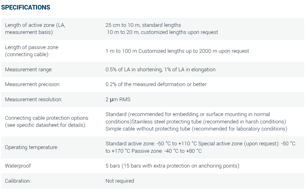 For surface mounting or embedding in concrete and mortars. Ideal for long-term structural deformation monitoring. 20 year track record in field applications.