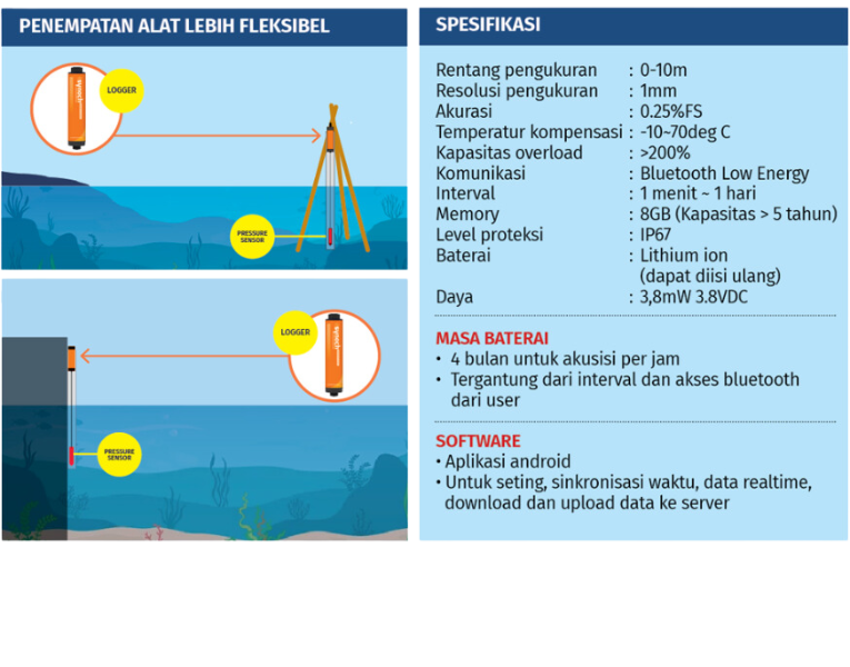 Pressure Gauge Sensor:A device that records changes in pressure, which will be converted into changes in water surface elevation. During the installation process, the device is inserted into a PVC pipe that will be buried in the ground. The sensor is connected to the logger using a cable and can measure up to a depth of 50 meters with a sensor accuracy of 0.3% of the full scale. This means that if the measurement range is 1 meter, the accuracy is 3 millimeters.